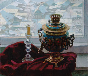 самовар, зимний вид за окном (как будто невзначай небольшой кусочек оконного проёма