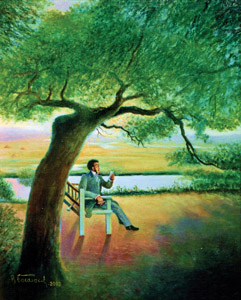 Рабочий день самодеятельного художника начинается в пять часов утра. А вдохновение не кончается никогда. В его картинах – простые и понятные образы России… Ветряная мельница на берегу убегающей вдаль реки. Стая гусей, клином пикирующая на скошенное поле. Букет ромашек и наполненный ягодами туес на широком сосновом пне. Прячущиеся в камышах лодки на фоне куполов далёкой церквушки. Зимняя повозка, исчезающая в глубине ослеплённого инеем березняка… Десятки пейзажей и натюрмортов, навеянных воспоминаниями детства и красотой родных сурских просторов, создал Виктор Иванович за эти годы. Особо любимая его тема – пушкинская. Ещё в школе он увлекался срисовыванием портретов великого поэта. А побывав в Тригорском, нарисовал несколько навеянных увиденным картин. Одну из них – «Дуб уединенный» - Виктор Иванович передал в дар Литературному музею «Дом Языковых», другую – «Скамья Онегина» - подарил музею «Усадьба Языковых». Здесь же хранится ещё один подарок от Басалаева – триптих «Россия», состоящий из картин «Оборона страны», «Иван да Марья» и «Опора Отечества». Его пейзажи можно увидеть в госпиталях, школах и библиотеках. Немало картин раздарил художник своим друзьям и знакомым. Просто так, от чистого сердца. Он и «Мономах» не обошёл вниманием, передав в дар журналу на юбилейном вечере архитектурный пейзаж с изображением одной из башен Псковского кремля.