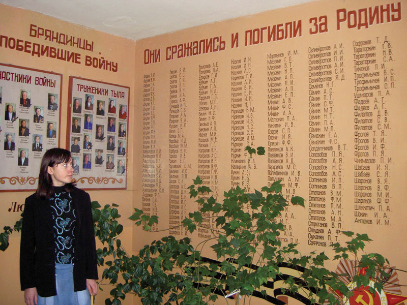 Зал боевой славы рассказывает о кровавых стычках гражданской войны (рядом с документами большевиков соседствуют материалы о судьбах белогвардейцев), о фантастической истории потопленного в Волге бронепоезда «Свобода или смерть», о трудовых подвигах тыловиков, о заслугах тракторной бригады Клавдии Маловой. Поисково-исследовательская работа вылилась в богатый материал на тему «Бряндинцы, победившие войну». Ребятами описаны судьбы всех 227 погибших в Великой Отечественной войне земляков.