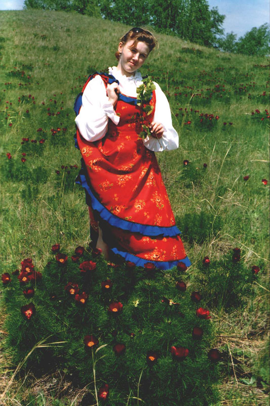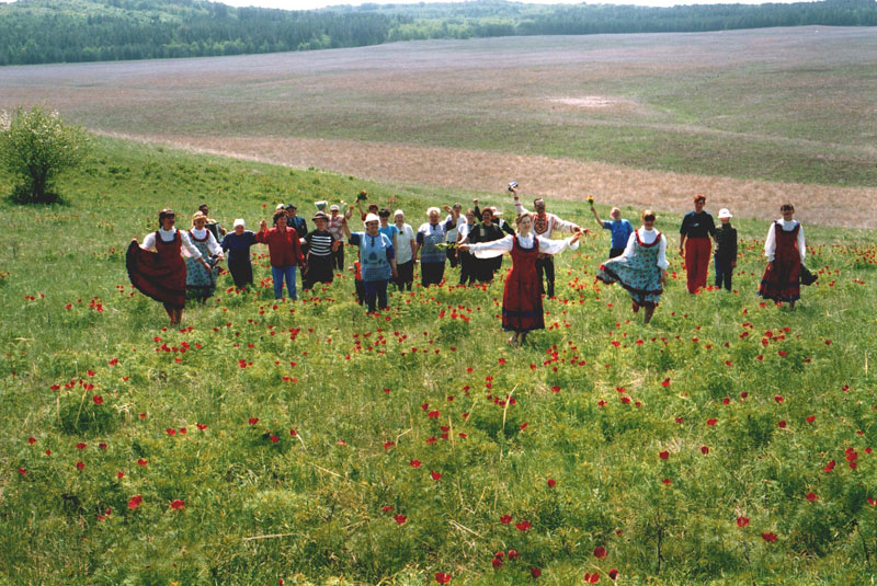 Так в мае 2002 года состоялся первый Праздник дикого пиона. На живописных Коржиных горах, украшенных цветущими пионами, состоялось народное гулянье, посвященное алому цветку. По преданию, все праздники цветов сопровождались песнями, шумными играми, всеобщим весельем. Мы решили не нарушать традицию, проверенную веками. Собравшихся на гулянье порадовали ансамбль русской песни "Рябинушка" (рук. Е.Н. Липатов) и хор ветеранов клуба "Золотая осень", возглавляемый Л.Б. Бутузовой и Е.И. Ермолаевой.