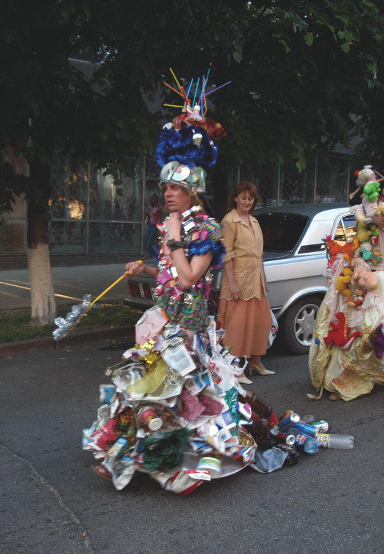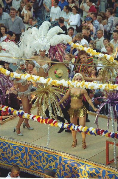 А вечером начался карнавал, потрясший жителей и гостей города своим великолепием и небывалым весельем. Ничего подобного Ульяновск никогда не видел на своих улицах: самые настоящие карнавальные автомобили, повидавшие известные карнавалы мира, медленно, сквозь огромную толпу народа продвигались по улице Гончарова, демонстрируя буйную фантазию конкурсантов. Перед жюри, которое возглавила популярная телеведущая Яна Чурикова, встала непростая задача: выбрать из двухсот экзотических костюмов самые-самые оригинальные. В итоге в финал вышли: "Карнавальная помойка" (ее автор Андрей Пономарев получил первый приз и отправился на отдых в Египет), "Избушка на курьих ножках", "Пиковая дама", "Цыпленок в яйце" и другие. Веселый праздник завершила группа "Блестящие".