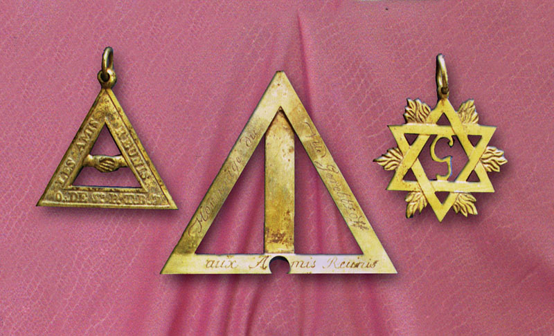 Все вышесказанное можно отнести к коллекции масонских знаков. Она невелика: всего пять единиц хранения. Они поступили в музей в 1970 году от Олега Матвеевича Головинского, проживавшего в то время в Мичуринске, как знаки, принадлежавшие его деду Василию Андреевичу Головинскому, известному представителю кружка петрашевцев. Это два равносторонних треугольника с соединенными в пожатии руками в центре их и с надписью по лицевой стороне в переводе с французского «Соединенные друзья»; наугольник со стороной в 10 см и с надписью на французском языке «Почтение Соединенных друзей. Жеребцов»; маленький мастерок с костяной ручкой; пламенеющая звезда. Все они выполнены из латуни и, судя по имеющемуся на каждом из них колечку, носились на груди. Указанные предметы уникальны и еще ждут последующего и всестороннего своего исследования.