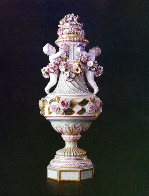 История двух декоративных ваз из собрания Н. Шатрова пока не разгадана. Очевидно одно: вазы - триумф мейсенской мануфактуры. Все четыре части соединенны в одно целое: подставка, ножка, тулово, крышка. Здесь сочетаются живопись, лепнина; силуэты ваз украшают гирлянды цветов и амуров. В XX веке ни один мастер не смог воспроизвести эти вазы. Когда наш музей посетили мастера мейсенского фарфора, они признались, что пытались повторить подобные вазы для презентации особо важным персонам, но отказались от этой идеи: слишком трудоемкая работа.