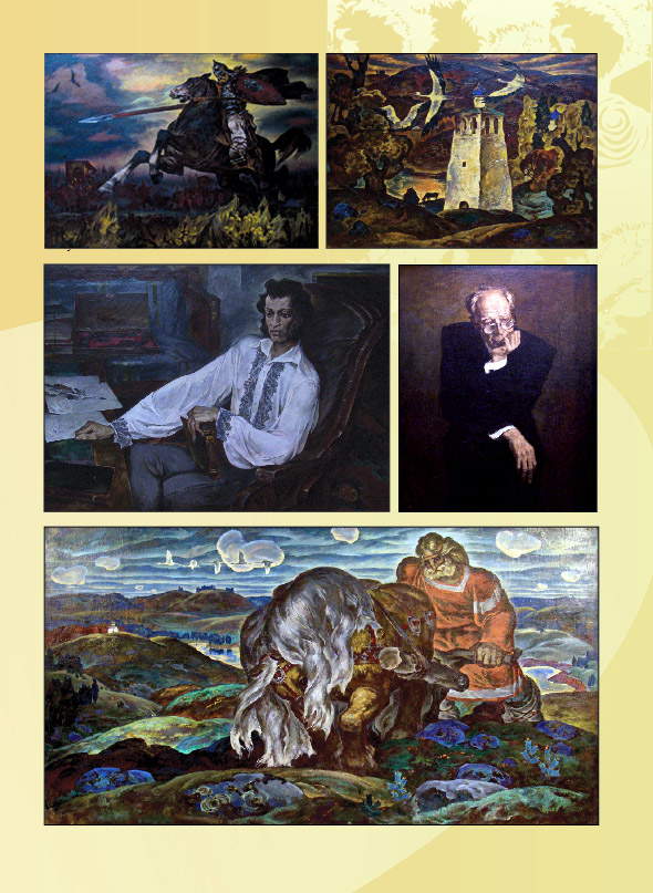 И какая живопись: напряженная, могучая в фигурах коня и всадника на фоне широко светающего неба; и как созвучны красные щит и древко копья красновато-лиловой рати в сизых волнах тумана (дивное обобщение дальнего плана!); и золотистые степные травы, еще спеленутые утренней росой...