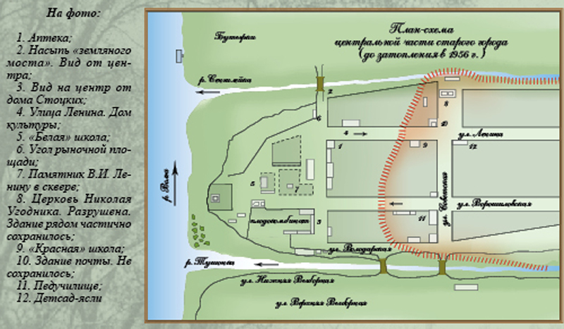 Схема, составленная Георгием Борисовичем Стоцким, и предоставленные им фотографии, выполненные маленьким фотоаппаратом в 1950-е годы, дают некоторое представление о том, как выглядел Сенгилей до затопления и какие исторический постройки сохранились до наших дней. Незатопленная часть города на плане справа от линии берегоукрепления, отмеченной красным цветом.