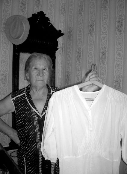 В проеме двери появляется невестка Галя, протягивает отглаженное бабушкино платье. Семеновна стягивает с головы платочек, расчесывает волосы, бережно берет в руки платье, крутится возле трюмо, которое когда-то составило царственную компанию круглому столу и фанерному шкафу.