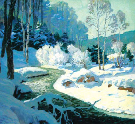 Мастер цвета, он долго колдует над каждой работой – поэтому они столь различны по колориту, по состоянию природы. Вот зыбкий туман наползает от реки на лесную опушку («Вечерний туман»); вот сделанный на одном дыхании серожемчужный «Март» с двумя березами справа; вот кружево инея над быстрой, еще не замерзшей речкой Тушной. И всюду ясная, какая-то детская любовь к природе. Гости вернисажа отмечали поэтичность представленных пейзажей. Цитировали Бунина: «Лес точно терем расписной, Лиловый, золотой, багряный...»