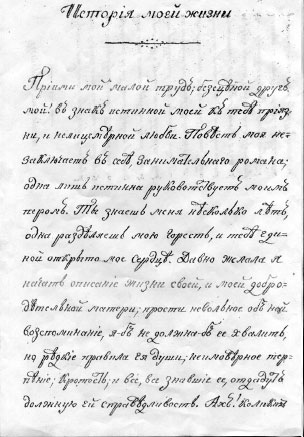 «…Цель моей любезной матери была отвезти в Санкт-Петербург меня, в Екатерининский институт; между тем, как брат мой, взятый уже от бабушки, находился давно уже в Московском пансионе. Много стоило труда уговорить её отпустить его учиться; по чрезмерной привязанности к внуку, бабка моя была непреклонна, но родительница наша, жившая только для пользы детей своих, чтоб дать приличное воспитание, настояла в сем случае, и батюшка не препятствовал.