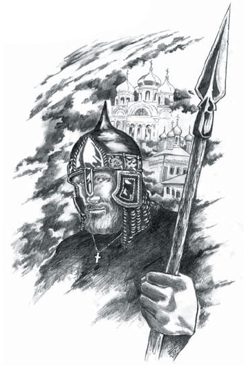 Пересвет поставил ведро на землю перед гнедым. Тот тихо, радостно заржал, почуяв друга, и по самые уши залез в ведро с остатками овса. «Народ, говоришь, поможет? Поможет. Но я знаю, что девять человек из десяти на поле лежать останутся». Монах постоял ещё несколько минут в раздумье, затем твёрдым шагом прошёл в строение, в котором были сложены земледельческие орудия монастыря. Пробрался в дальний угол. Здесь, установив фонарь повыше, Пересвет начал доставать доспехи, бесформенной грудой лежавшие в пыли и паутине уже много лет с тех пор, как он переступил порог монастыря. Поднял стальной наголовник – ерихонку, покрутил в руках, тщательно сдувая пылинки, аккуратно надел на голову – будто не снимал никогда. Копьё привычно легло в ладонь. Проверил тяжесть его на весу, провёл пальцем по острию, по длинным острым ножам, идущим от наконечника почти к середине древка. Приставил к стене. Поднял массивный круглый щит, опробовал на прочность ремни держака, покрутил перед собой послушным мечом. Положил рядом с копьём.