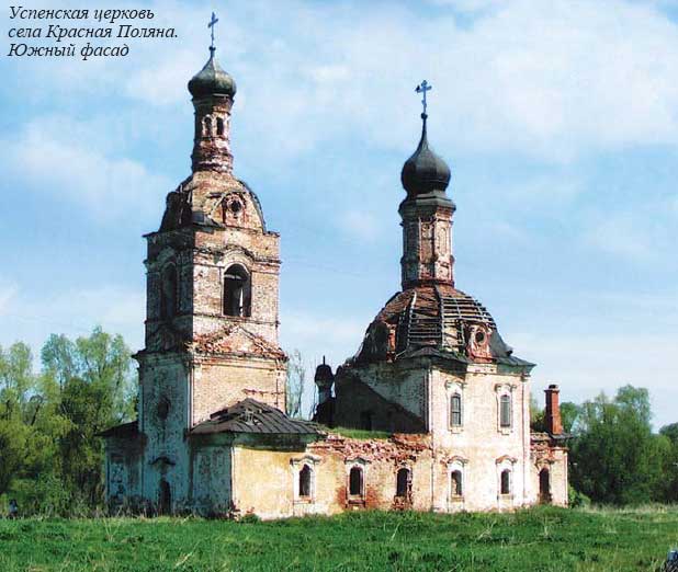 Издалека, с трассы, сельский храм кажется небольшим и неказистым. Но стоит только подъехать к нему поближе и всмотреться в детали, сразу понимаешь, что перед тобой один из архитектурных шедевров далекого прошлого, удивительный по красоте памятник эпохи барокко. По документам известно, что Успенская церковь с приделом Иоанна Златоуста возводилась в Красной Поляне в царствование Елизаветы Петровны на средства одного из правителей Казанского края, богатого помещика Мефодия Кудрявцева. Выстроенный к 1757 году по традиционной схеме «кораблём», но со смещённой от продольной оси колокольней, храм этот и сейчас, несмотря на частичные разрушения, поражает своим совершенством, редкой для провинциальных культовых сооружений той эпохи пропорциональностью, изяществом чисто барочных форм и уместностью каждой детали скромного декоративного оформления фасадов. Всё в этой церкви, включая почти идеальную кладку мощных стен из старинного большемерного кирпича, говорит об опытности и таланте неизвестного зодчего, а также о щедрости храмоздателя Кудрявцева.