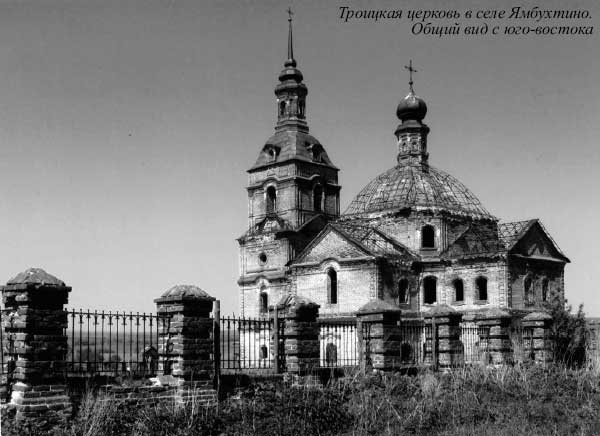 Такие плохо вписываются в книжные схемы, а потому их не любят и часто игнорируют искусствоведы. По документам удалось установить, что Троицкая церковь села Ямбухтино (двухэтажная четырёхпрестольная) возведена в 1741 году, причём время её постройки подтверждает и даже уточняет обнаруженное на одной из массивных железных плит клеймо: «BTS, 1745». Главный престол этого храма (в «верхней церкви») был освящён в честь Святой Троицы, а три придельных алтаря – во имя Сергия Радонежского, Архангела Михаила и Иоанна Богослова. Таким образом, Троицкая церковь в Ямбухтине построена всего лет на 10-15 раньше, чем Успенская в Красной Поляне, причём в том же архитектурном стиле и, возможно, тем же мастером.