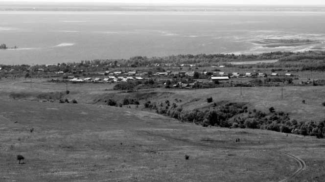 «Полтораста дворов села разместились в горной котловине над Волгой. Слева гумна деревни обрезает бурливая обрывистая речушка, впадающая в Волгу. Сзади тяжело надвинулись на село древние нелюдимые горы под шапками леса. Впереди в лоб захлёстывает деревню Волга. И только справа по высокому берегу убегают вдаль богатые чернозёмные поля».