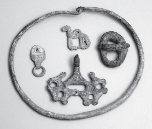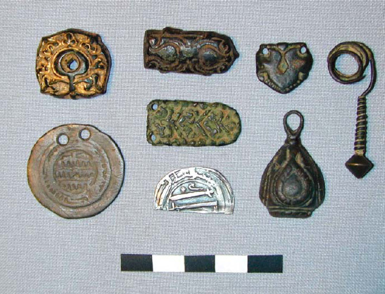 Существует фрагмент наконечника ремня, имеющий аналогии в погребении 3 кургана 14 раннеболгарского Новинковского II курганного могильника, 3 полулунные накладки из плоских пластин, накладка с кольцом, идентичная материалам Крюковско-Кужновского могильника, накладка восточно-тюркского типа (близкие к ней происходят из Даг-Аразы на Саяно-Алтае и Неволинского могильника в Прикамье), четырёхугольная накладка, прямоугольно скошенная налево, и схожая с ней накладка с округло-выпуклой правой стороной, серьга салтовского типа. В коллекции присутствует коромыслообразная копоушка с округлой петлёй на середине длины, датируемая второй половиной VIII– первой половиной IX века. К IX веку относятся округлая и фигурная накладка, аналогичная материалам Дмитриевского могильника, коньковая накладка, идентичная материалам могильника Мыдлань-Шай.