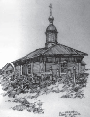 Вот он, небольшой приземистый домик в три окна, ветхий, посеревший от зноя, дождей и морозов. Он, конечно же, отличался от деревенских изб, одну из которых художник поместил на заднем плане. Не только своим куполом, играющим на солнце, но и шатровой крышей, и обшитыми снаружи стенами, и по-особому украшенным верхом, и металлическими решётками на окнах, и фигурными столбиками когда-то заботливо сделанного, но растащенного и сгнившего забора.