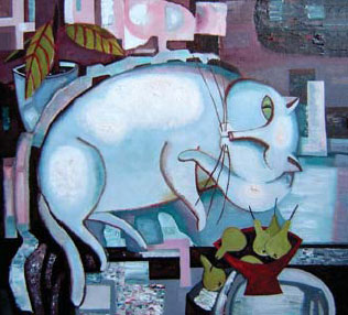 В её картинах мы погружаемся в мир образов-символов. Перед глазами из картины в картину, вариациями одной темы проходят персонажи этого странного живописного мира: вот хрупкая Птица, словно случайно впорхнувшая и опустившаяся на край стола, на край одежды или на ладонь женщины; вот знакомый нам вальяжный Кот, то мирно спящий, то гордо восседающий в окружении привычных глазу домашних предметов; вот прекрасная Дама, чью хрупкость и аристократичность передаёт филигранно выписанная роза в её руке. Сюжеты озадачивают, заставляют подолгу стоять перед картиной, разгадывать шарады замысла, пытаться проникнуть в суть, в глубины увиденного, в «закадровость», в «зазеркалье». Комедианты и фокусники, птицеловы и музыканты.