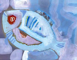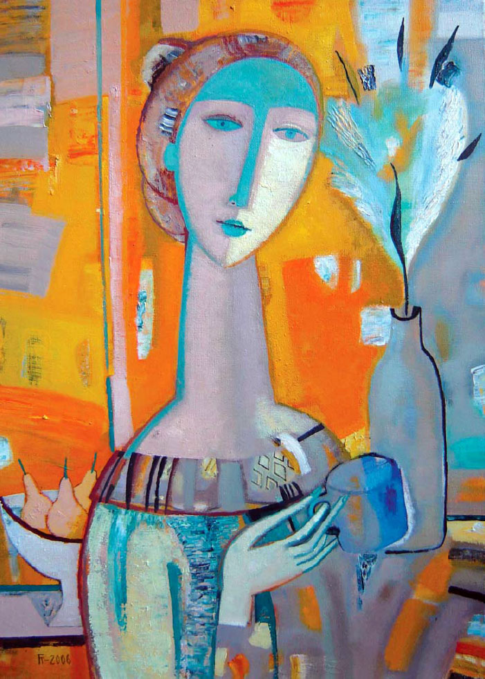 Мы часто грустим по поводу быстротечности времени, а как передать кистью эту грусть? Может быть, так: лампа, напоминающая песочные часы, сквозь пространство которой виден острый, удивлённый профиль, или одинокий музыкант, играющий на скрипке. Почему картина «Скрипачка» выполнена в розовом цвете, а картина «Сон» – в синем? А разве можно объяснить какого цвета бывают сны, и в каком цвете передать радость, исходящую от музыки? Каждая картина выдержана в одном главном цвете – розовом, ярко-синем, изумрудном, жёлтом, белом.