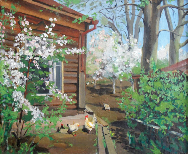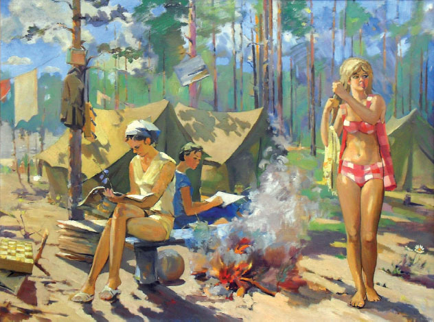 А ведь и у самого Юрия Васильевича накопилось множество стихов, некоторые из которых уже опубликованы. Недостаток профессионального мастерства искупается предельной искренностью. Та же искренность и в живописи. В вестибюле департамента культуры висит очень показательная в этом смысле работа, изображающая субботник – закладку парка Юности на волжском склоне. Большое полотно населено людьми, близкими сердцу автора, – и ох как можно позавидовать такому многолюдью! Тут и семья художника, и великий Пластов в полотняной своей рубахе, и художественная братия помоложе. Судя по тому, что автор этих строк изображён там совсем юным, писалась картина в пору величайших хлопот с художественной школой. Ясно, что о завершённости полотна не могло быть и речи, так и осталось оно искренним и чистым человеческим порывом, без тех умозрительных комбинаций с колоритом и композицией, которые, громко говоря о выучке, нечасто трогают сердце.