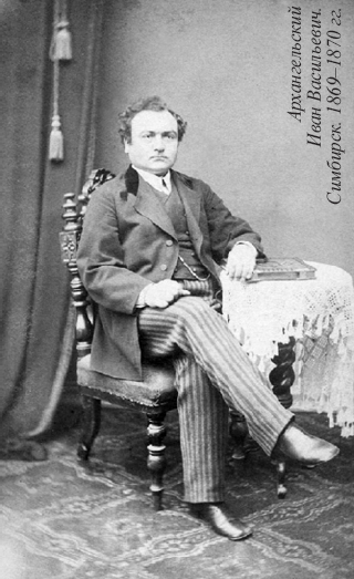 В 1851 году Иван поступил в Симбирское духовное уездное училище. После публичных испытаний и получения свидетельства, в котором отмечались успехи в учёбе и поведении как «весьма хорошие», Иван Архангельский был уволен из среднего отделения училища «по собственному желанию и по прошению родителей». 22 марта 1858 года он «определён в число канцелярских служащих Симбирской Духовной консистории». Формулярный список чётко фиксирует его продвижение по службе и произведение в чины: с февраля 1863 года определён в письмоводители при Его Преосвященстве Евгении, в мае 1871 года произведён за заслуги в коллежские регистраторы, в апреле 1874 года – в губернские секретари, с сентября 1875 года определён на должность регистратора консистории.